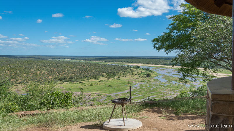 Unser Bungalow Nr. 11 (BBD2V) bietet einen fantastischen Blick auf den Olifants River. Auch hier die obligatorische Terrasse mit Außenküche sowie einem Braai. Einzig die Aussicht auf den Nachbarbungalow (Nr. 10) stört ein wenig. Dieser ist vor Kurzem abgebrannt und nur einige klägliche Überreste stehen noch.